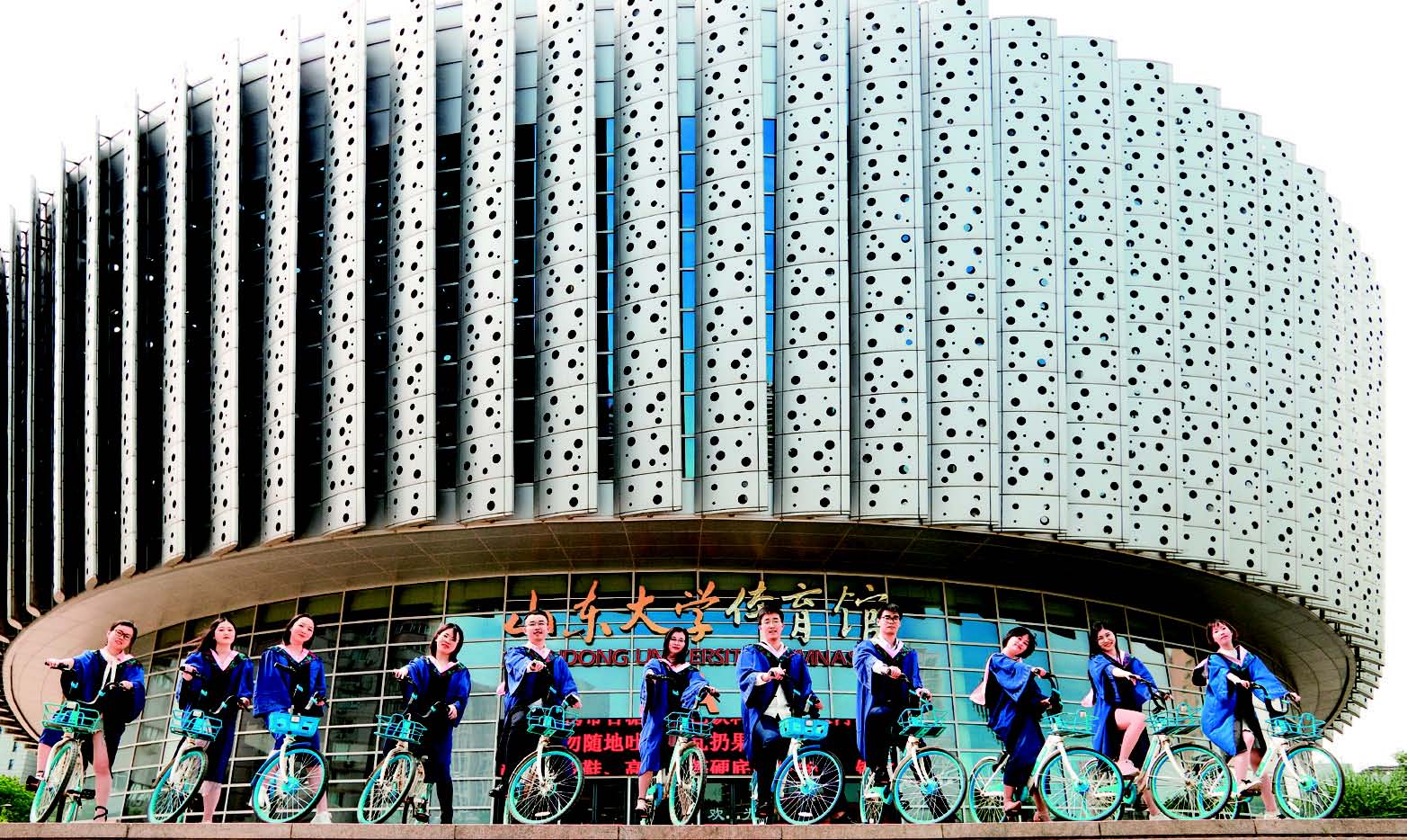 山东大学学生在体育馆前拍摄毕业照 陈时光摄