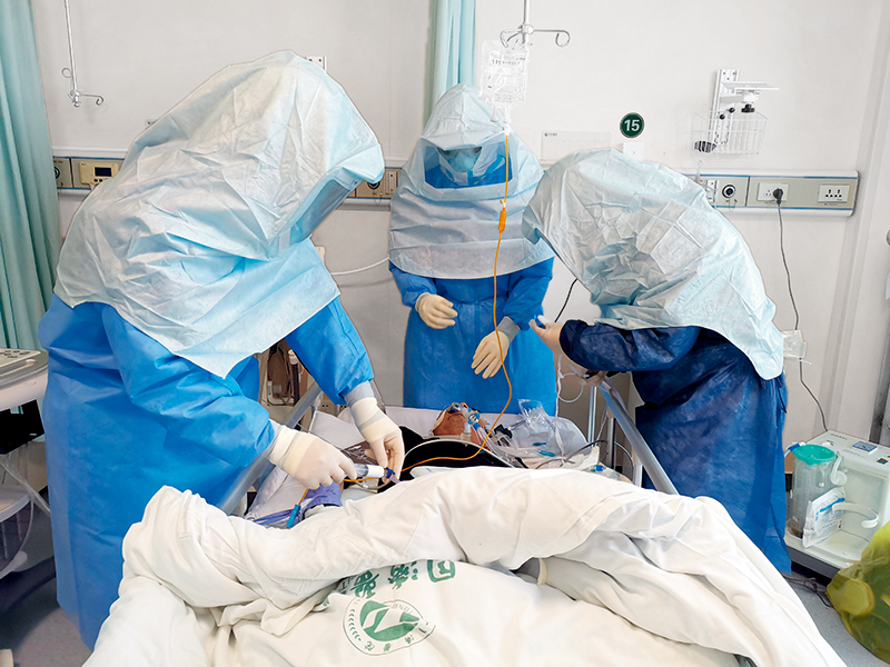 谢坤二人穿上防护服进入污染区,立即准备插管辅助用药。谢坤记得,当他们来到病床前时,患者氧饱和度为87%,嗜睡。
