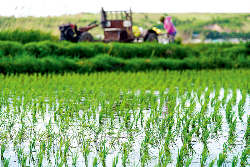 6月11日,吉林省延边朝鲜族自治州和龙市光东村,农民在稻田间进行管护作业