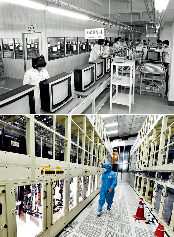 上图为深圳特区华利电子有限公司从日本引进的彩色电视机生产线,1984年6月19日建成正式投产(李长永摄/本刊);