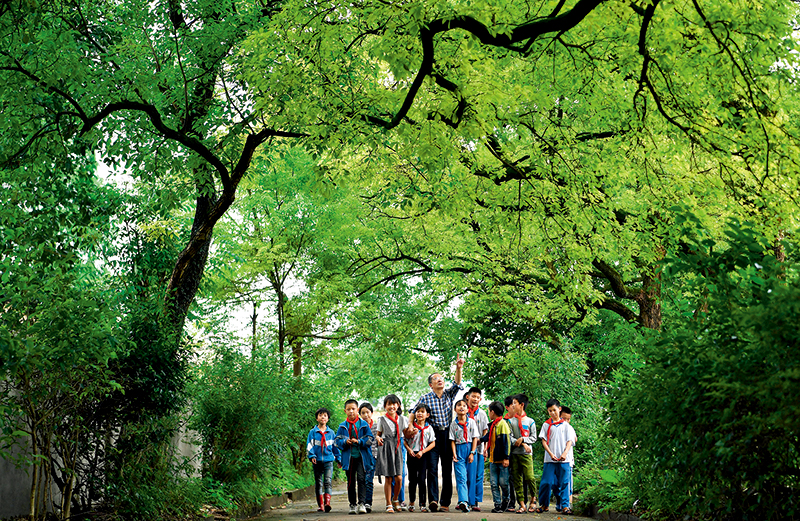 “校长爷爷”黄梅生带着孩子们在林间散步(2019年5月17日摄)。黄梅生是江西省分宜县第一小学原校长。