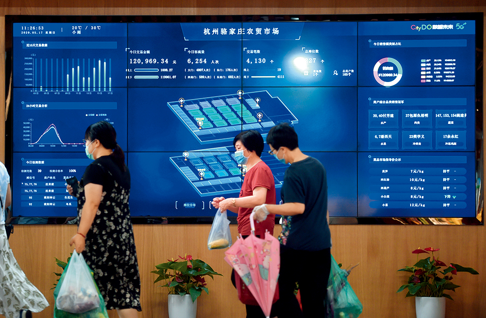 浙江省杭州市的5G 农贸市场——骆家庄农贸市场的大屏幕上实时显示交易、客流等相关情况(5月17日摄) 韩传号摄/本刊