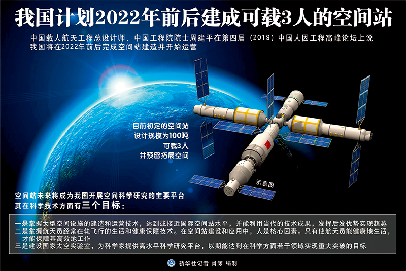 2022年前后,中国空间站将正式完成在轨建造任务。届时,中国将在空间站上部署航天医学、空间生命和生物、材料、微重力燃烧和流体、物理、天文等领域的高水平实验设备,科学家可在空间站开展大量空间科学前沿领域的研究工作。