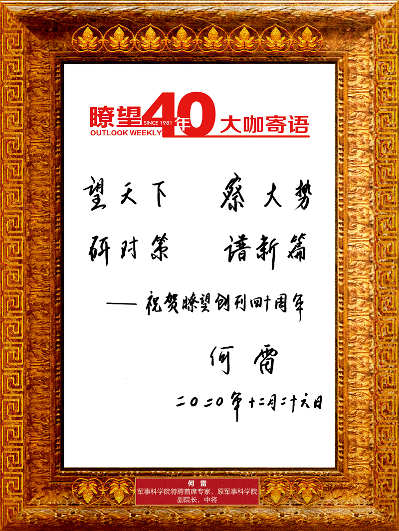 “白日依山尽,黄河入海流。欲穷千里目,更上一层楼。”我作为一个关注、学习《瞭望》的热心读者和参与者,衷心希望《瞭望》新闻周刊:承担起新闻舆论工作“高举旗帜、引领导向,围绕中心、服务大局,团结人民、鼓舞士气,成风化人、凝心聚力,澄清谬误、明辨是非,联接中外、沟通世界”的职责,在党带领人民奋力迈向全面建设社会主义现代化国家的前进道路上、在进行具有许多新的历史特点的伟大斗争中,不忘初心、牢记使命,勇立时代潮头,发挥自身优势,运用多种手段和形式,及时有效地向国内外传播党中央的声音,进一步讲好中国共产党治国理政的故事,中国人民奋斗圆梦的故事,中国坚持和平发展合作共赢的故事,中国军队捍卫国家利益、维护世界和平、服务构建人类命运共同体的故事,不断提高传播力、引导力、影响力、公信力,努力打造世界一流的新闻周刊,向世界展现真实、立体、全面的中国,让世界更好地认识和了解中国,为党的宣传思想和新闻舆论工作作出新的更大贡献,创造更加辉煌的业绩。□(作者为军事科学院特聘首席专家,军事科学院原副院长,中将)