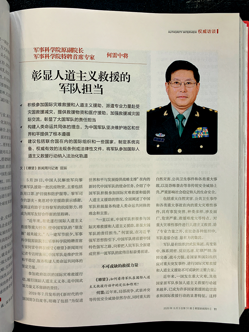 2020年八一建军节前夕,《瞭望》新闻周刊记者就中国军队积极参加国际人道主义救援、彰显大国军队责任担当等话题对我进行了专访。