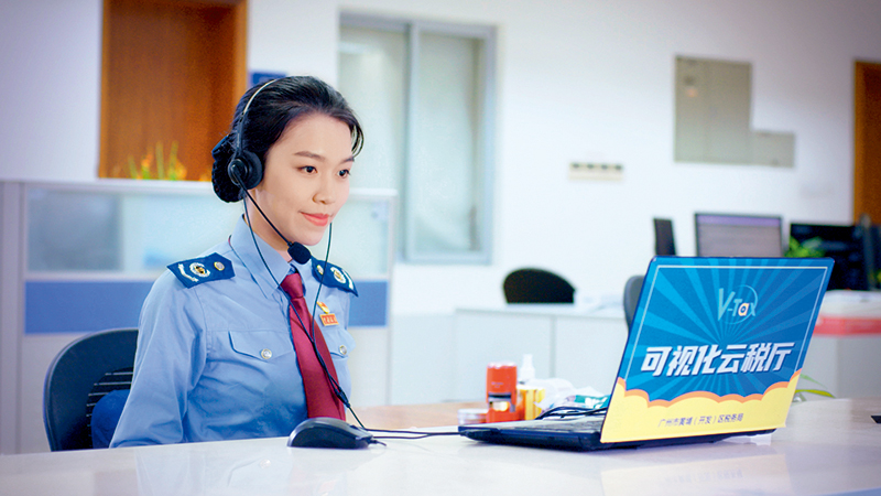 国家税务总局广州市黄埔区(广州开发区)税务局税务人员正通过视频远程受理纳税人的办税业务 钟冰摄
