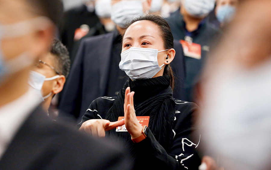 会的全国政协委员、中国残疾人艺术团团长邰丽华用手语“唱”国歌 张玉薇摄本刊