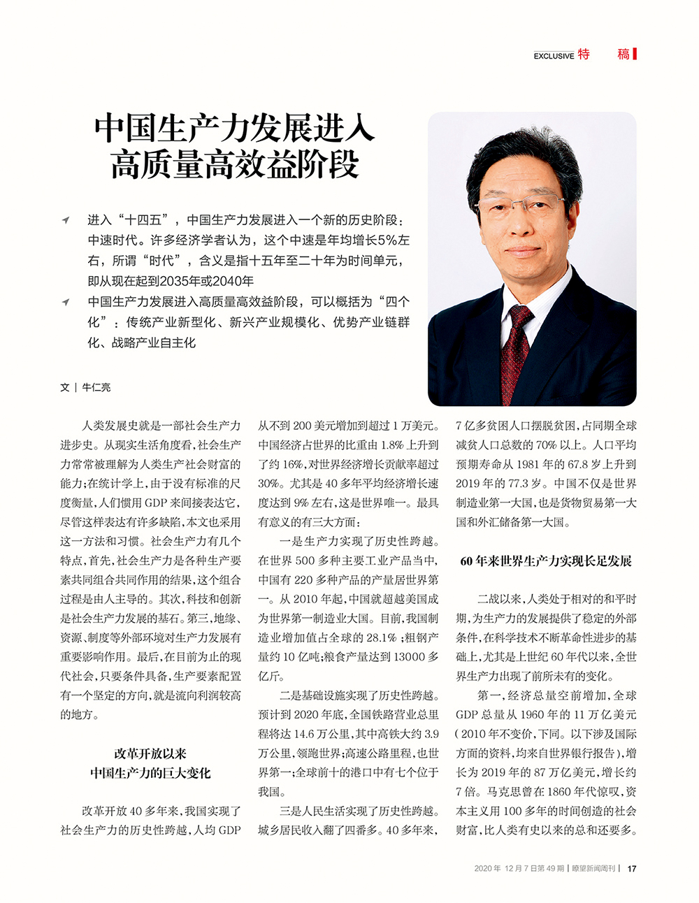 进入21世纪,尤其是党的十八大以来,中国特色社会主义步入新时代,我国改革开放进入了高质量发展新阶段。作为中国生产力学会会长,应约在2020年第49期《瞭望》发表了《中国生产力发展进入高质量高效益阶段》一文。