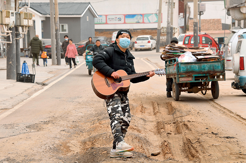 北京市通州区宋庄镇尹各庄村,小海弹奏吉他唱歌(3月15日摄) 任超摄/本刊