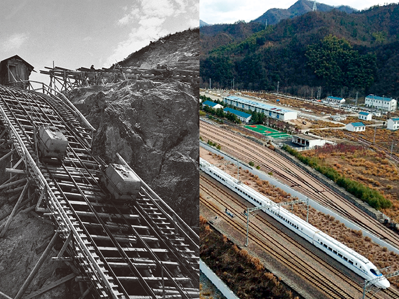 左图:1957年金寨响洪甸水库工地上吊车运送混凝土 王永嘉摄;右图:2019年高铁驶出金寨火车站 张端摄/本刊