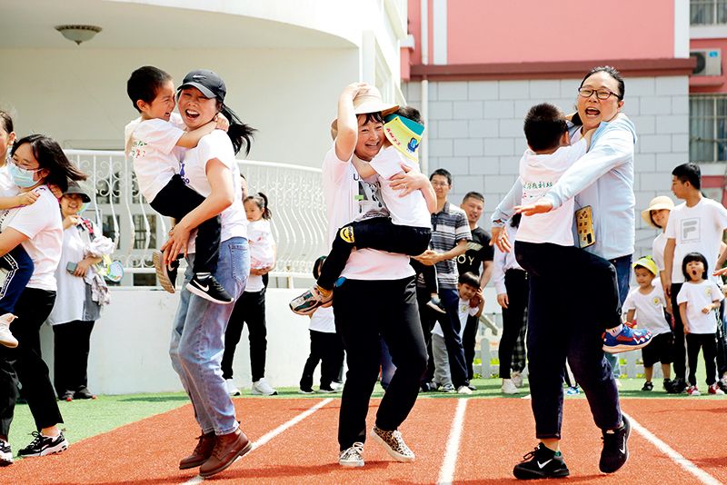 5月30日,江苏省连云港市海州区一所幼儿园,家长与小朋友们一起进行亲子趣味游戏 王春摄/本刊