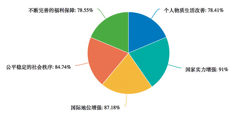 在“作为年轻一代,你最愿意为中国共产党点赞的是?”一题中,国家实力增强和国际地位增强得票率最高,均在九成左右。