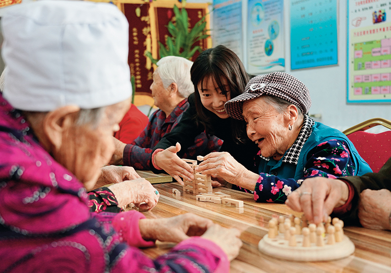 5 月21 日,河北省张家口市万全区孔家庄街道气象后街社区阳光家园托养中心工作人员在陪老人玩益智游戏 牟宇摄/ 本刊