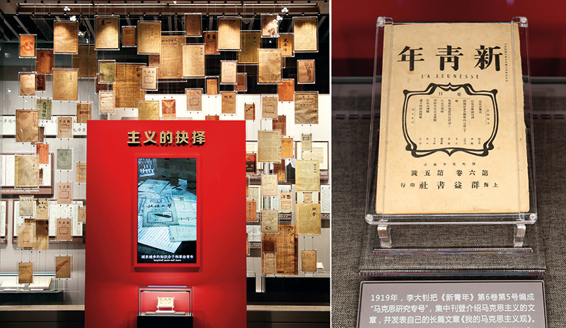 大型立体式视觉置景名为“主义的抉择”,100 件五四运动前后传播马克思主义、社会主义的报纸杂志,错落陈列在玻璃墙上。