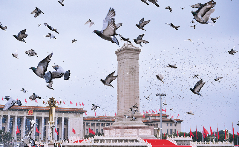 这是庆祝大会现场和平鸽展翅高飞 孙非摄/本刊