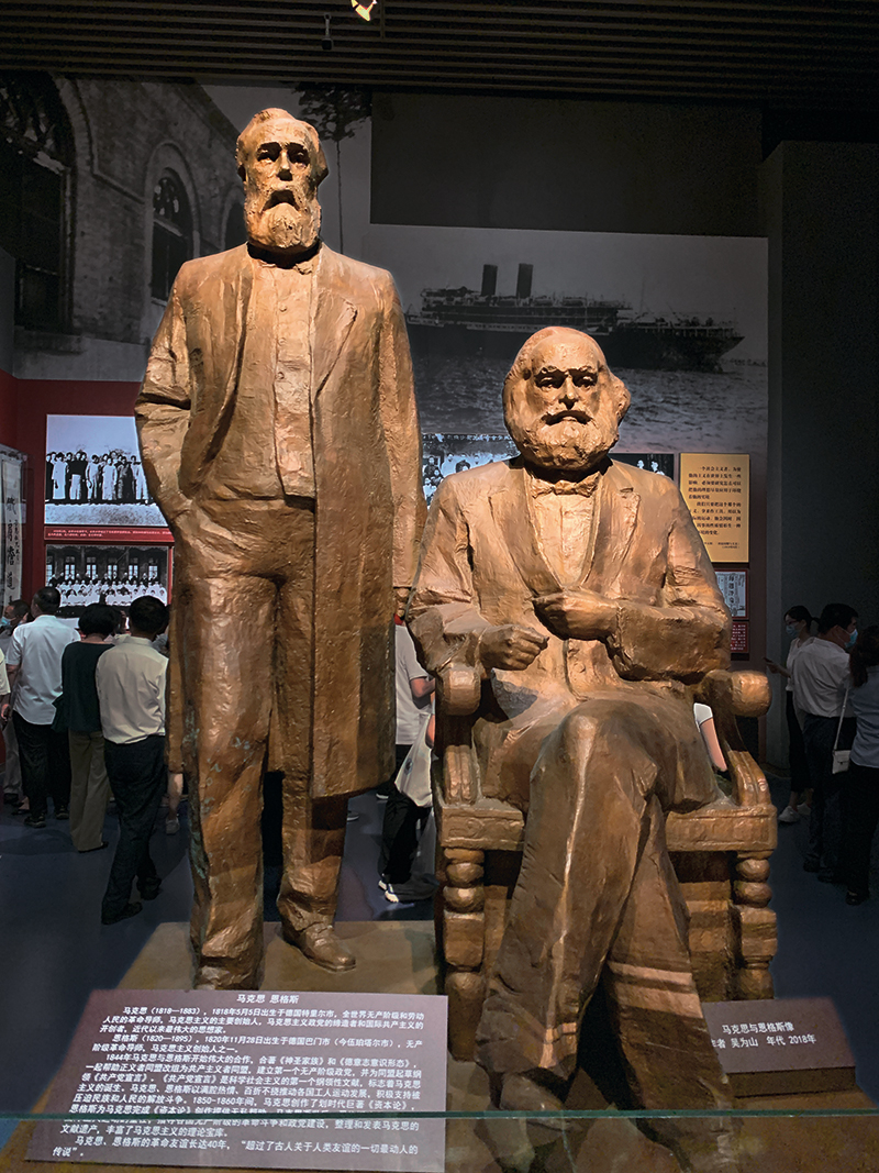 在“‘不忘初心、牢记使命’中国共产党历史展览”上展出的马克思、恩格斯雕像(7 月25 日摄) 杨乐摄/本刊