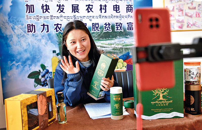 在西藏加查县电商运营中心,直播带货“小网红”洛桑卓玛通过电商平台推介当地的土特产(3 月28 日摄) 张汝锋摄/本刊