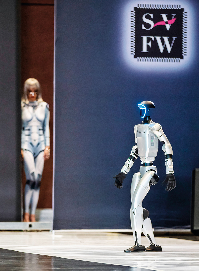 机器人和模特在美国加州旧金山湾区的“2024 硅谷时装周”上走秀(2024 年 11 月 23 日摄)董旭东摄 / 本刊