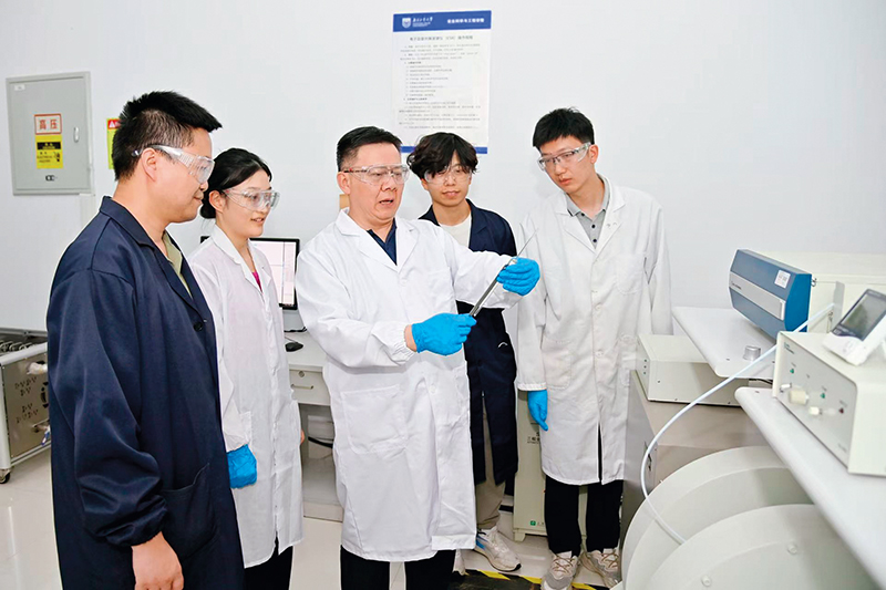 蒋军成(中)和团队成员在实验室交流讨论(2025 年 7 月 8 日摄) 受访者供图