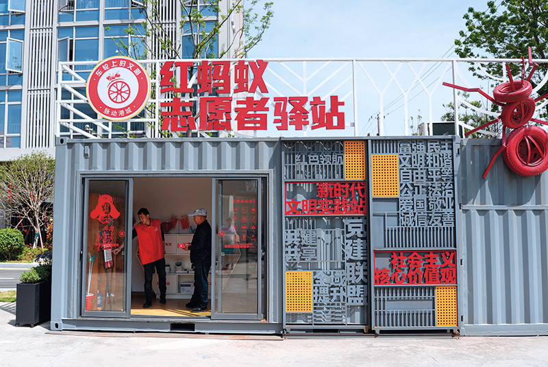 志愿者在浙江省宁波市北仑区霞浦街道物流工业社区党群服务中心“红蚂蚁”志愿者驿站为集装箱卡车司机服务(2025年 4 月 10 日摄) 黄宗治摄 / 本刊