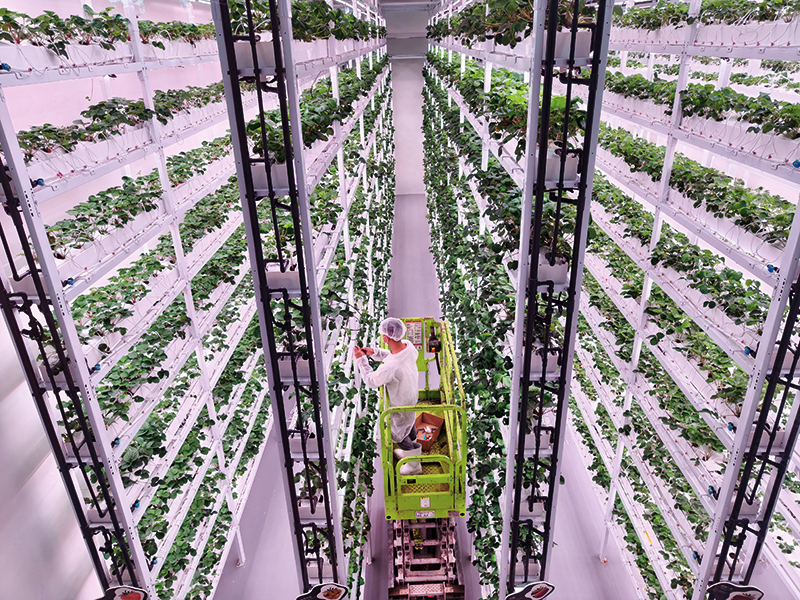 在中国农业科学院都市农业研究所“超级植物工厂”,工作人员正在对草莓进行管护(2025 年 8 月 19 日摄) 李力可摄 / 本刊