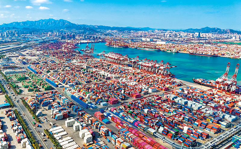 货轮在青岛自贸片区装卸货物(2025 年 11 月 5 日摄) 新华社发(张进刚摄)