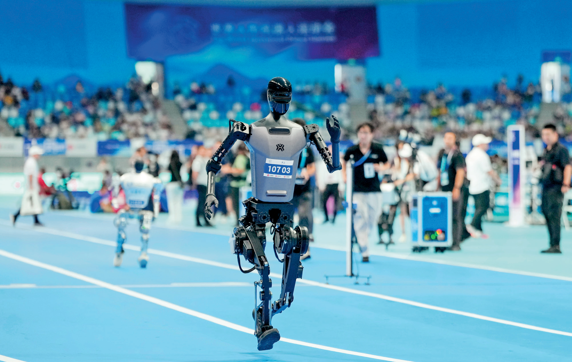 来自天工队的人形机器人(前)在比赛中(2025 年 5 月17 日摄) 鞠焕宗摄 / 本刊