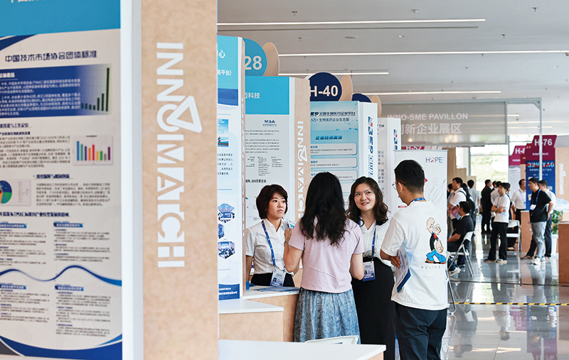 参观者在上海举办的浦江创新论坛技术转移大会现场交流讨论(2025 年9 月 21 日摄) 方喆摄 / 本刊