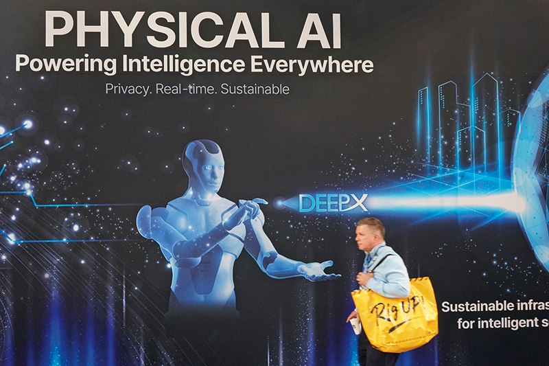 一名男子在 2026 年美国拉斯维加斯消费电子展上走过印有“物理 AI”字样的展台(2026 年 1 月 7 日摄) 新华社发(曾慧摄)