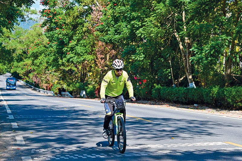 游客在位于海南的环热带雨林国家公园旅游公路保亭段骑行(2025 年 1 月 30 日摄)蒲晓旭摄 / 本刊