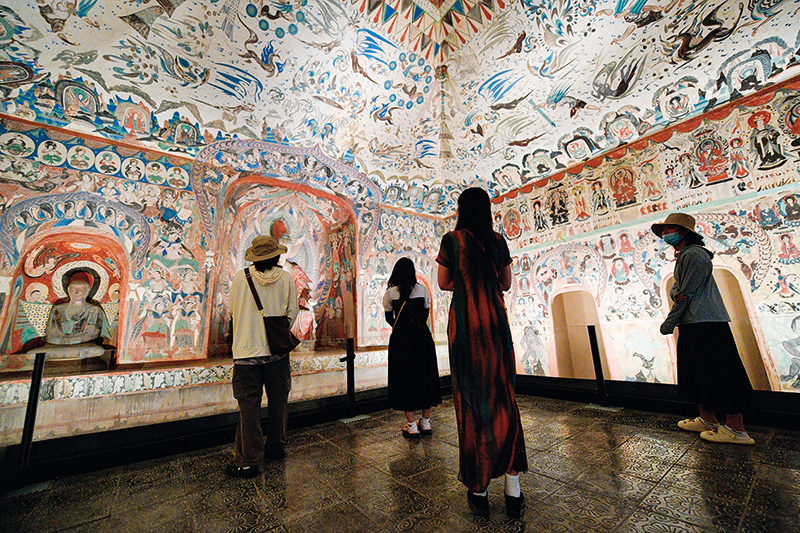 在敦煌石窟文物保护研究陈列中心,游客参观莫高窟复制洞窟第276窟壁画(2024年6月7日摄)郎兵兵摄 / 本刊