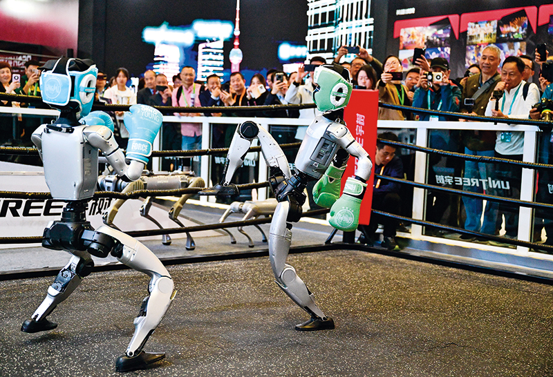 在第八届中国国际进口博览会宇树科技展台,人形机器人进行格斗表演(2025 年 11 月 6 日摄)蔡湘鑫摄 / 本刊