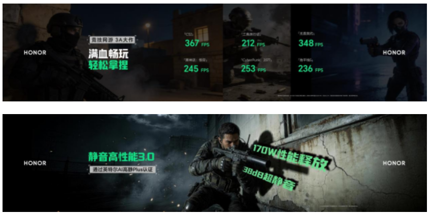 荣耀WIN游戏本系列以“赢者通吃”为核心理念,主打极致游戏体验。其中,旗舰机型H9凭借行业首创的“2+4”轴流风扇散热结构,实现至高270W性能释放,刷新游戏本散热上限。