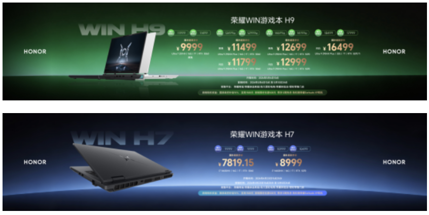 荣耀WIN游戏本H9将于5月6日10:00首销,国补价9999元起;H7现已开售,国补价7819.15元起。销售渠道覆盖荣耀商城、授权电商平台及线下门店。