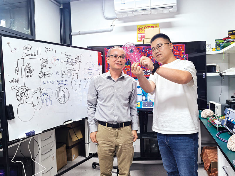 罗敏敏(左)和芯智达张垒博士在讨论“北脑一号”无线植入脑机系统的最新发展情况(2024 年 9 月摄) 受访者供图