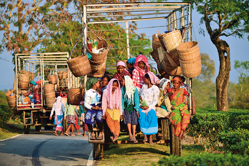 在印度阿萨姆邦纳加奥恩地区,工人采茶后乘车离开(2023 年 3 月 14 日摄) 摄影 / 本刊