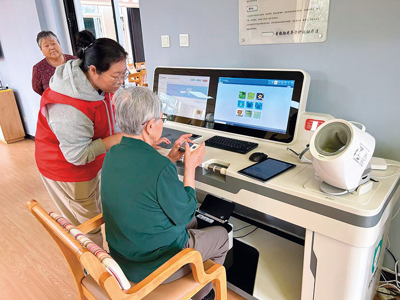 老人在天津市东丽区金桥街道综合养老服务中心使用智能设备进行身体检查(2024 年 10 月 9 日摄) 尹思源摄 / 本刊