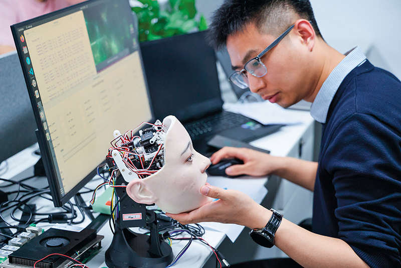 在数字华夏(深圳)科技有限公司,技术人员在调试一款人形机器人的面部表情(2025 年 3 月 27 日摄) 梁旭摄 / 本刊