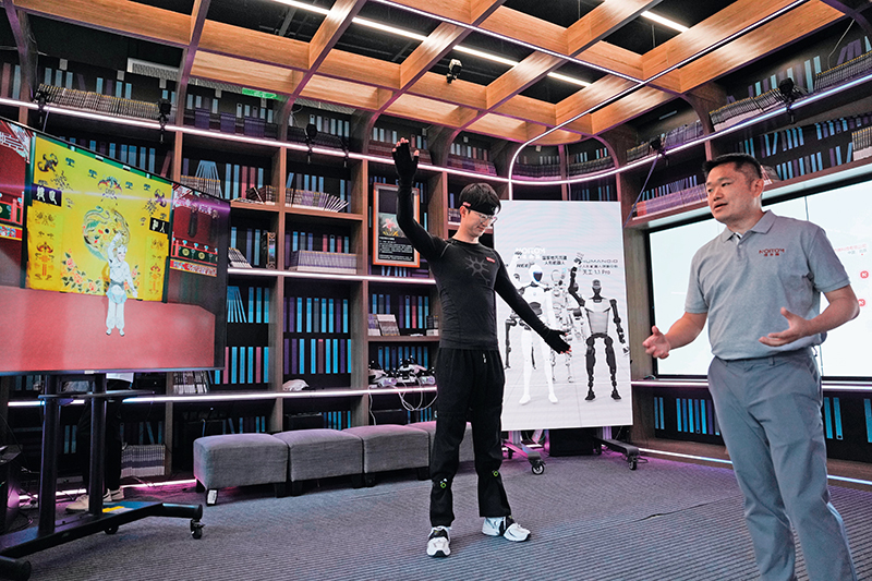 在北京石景山区中关村科幻产业创新中心,工作人员展示动作捕捉技术(2025 年 6 月 20 日摄) 郑焕松摄 / 本刊