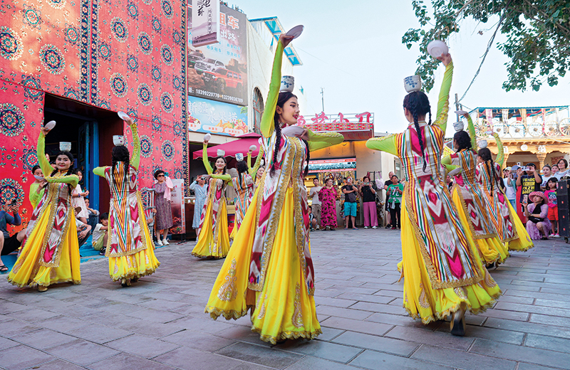 在新疆库车市的龟兹小巷,演员表演顶碗舞(2025 年 7 月 22 日摄)王婧嫱摄 / 本刊