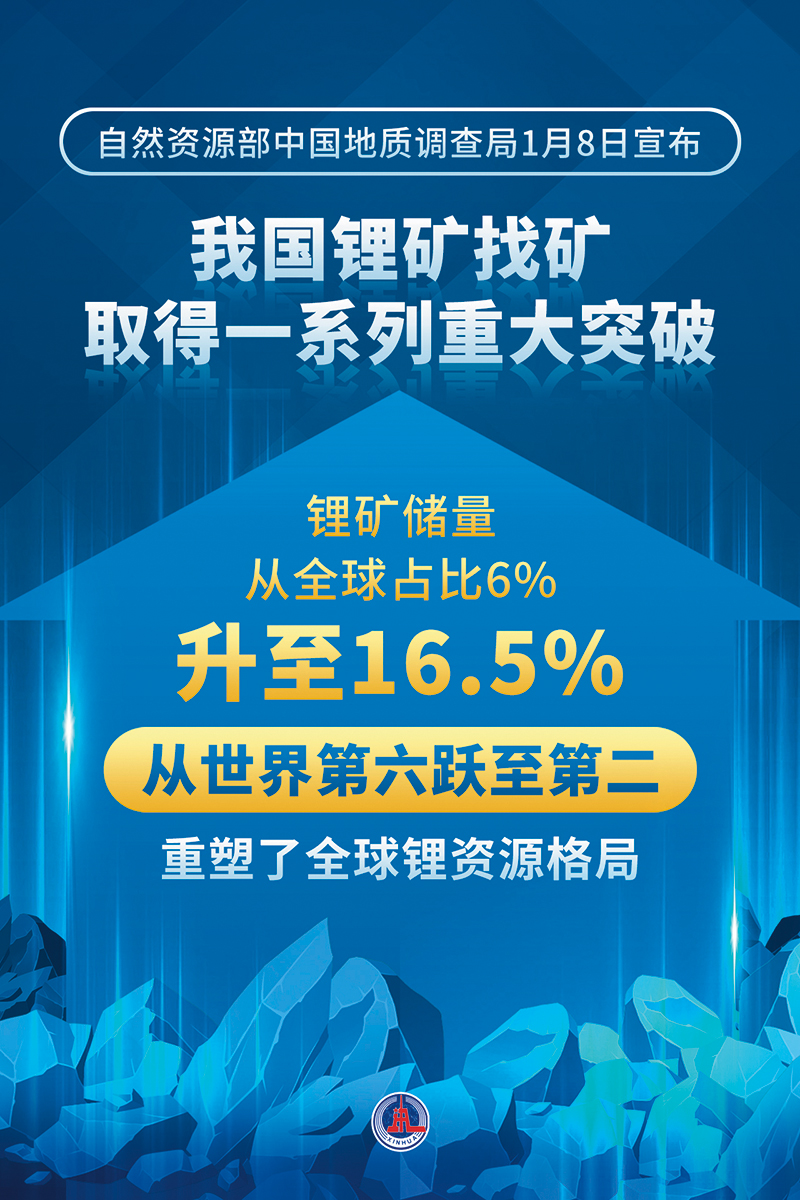 今年初,自然资源部中国地质调查局宣布,在西昆仑—松潘—甘孜发现长达2800千米的世界级锂辉石型锂成矿带,累计探明650余万吨,资源潜力超3000万吨。这一发现使我国锂矿储量全球占比从6%提升至16.5%,从世界第六跃至第二。