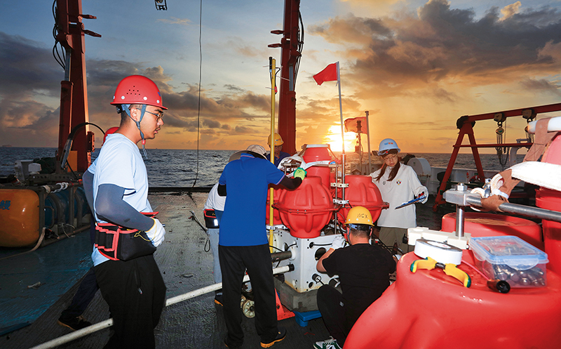 学生在执行海上科考任务期间检查设备准备布放(2025 年 7 月摄) 中国海洋大学供图