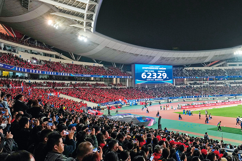 大屏幕显示共有 62329 名观众观赛(2025 年 11 月 1 日摄) 李博摄 / 本刊