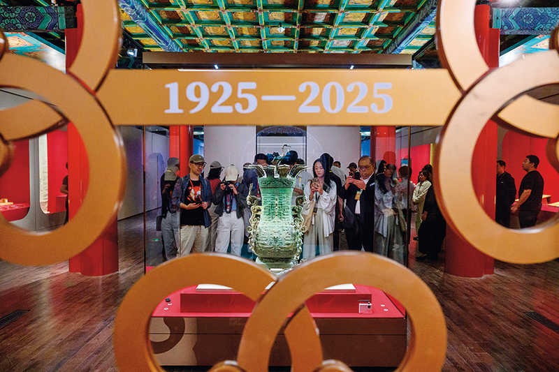 午后故宫,中外游客熙熙攘攘。威严的午门城楼如三峦环抱、五峰突起,特展参观者排起蜿蜒长队。经过激烈的“拼手速”,《瞭望》新闻周刊记者成功预约观展,得以近距离接触中华文明宝藏精华,追寻这座文化殿堂穿越百年始终守护中华文脉的不变初心,感受它与民族共命运的万千气象。