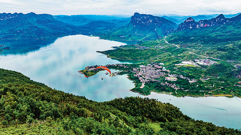 游客在贵州省六盘水市六枝特区牂牁江畔体验低空滑翔飞行(2025 年 7 月 9 日摄) 陶亮摄 / 本刊