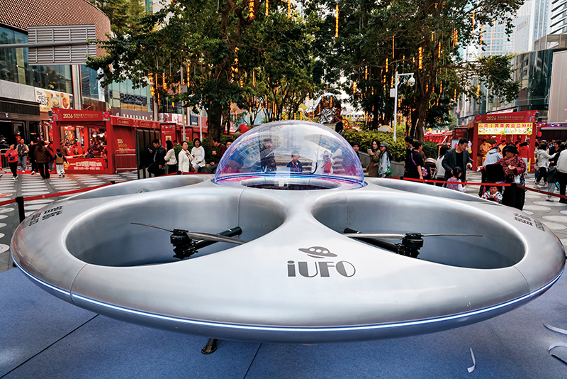 人们在深圳市福田区的节日广场花市观看飞碟形状的载人电动垂直起降飞行器(2026 年 2 月 10 日摄) 梁旭摄 / 本刊