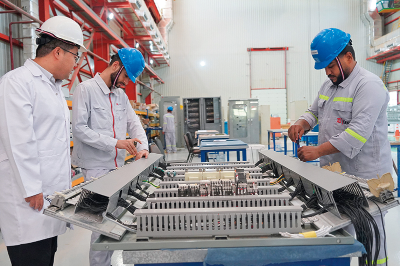 在位于埃及苏伊士省的中埃 · 泰达苏伊士经贸合作区,西电 -EGEMAC 高压电气有限责任公司的员工
